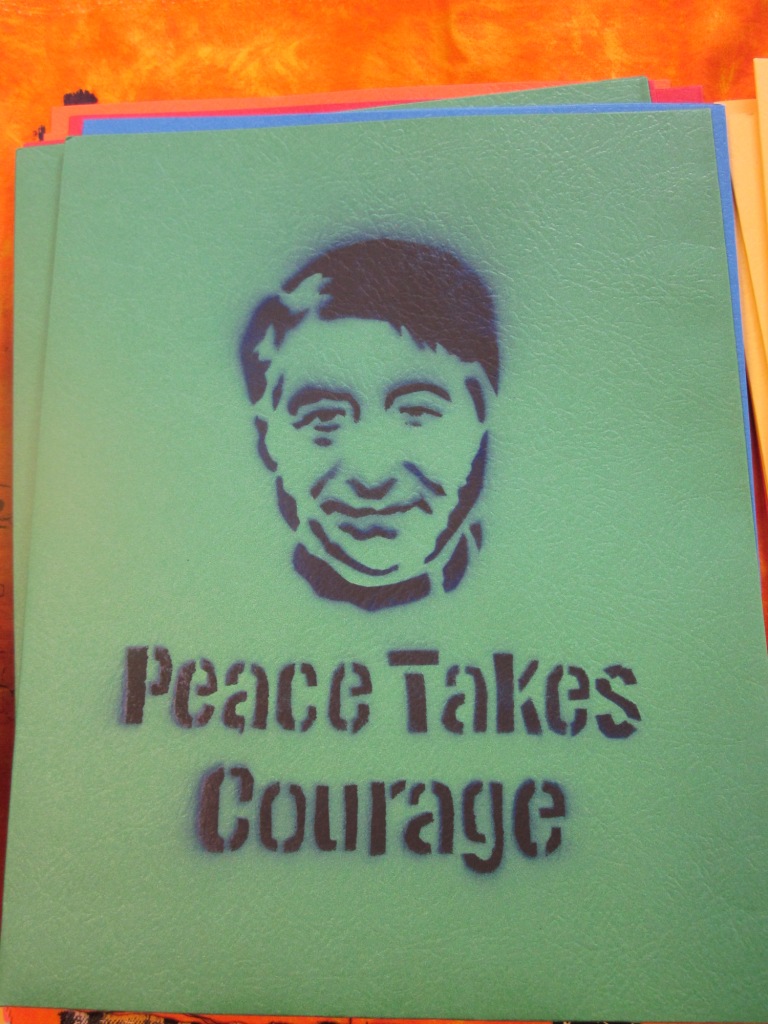 One of our stickers features Dolores Huerta holding a "Huelga!" sign and the words, "La Paz Requiere Coraje" (Peace Takes Courage). It was good to learn that today happens to be Dolores Huerta's 83rd birthday. It's also a national day of action for immigration reform. Si se puede!